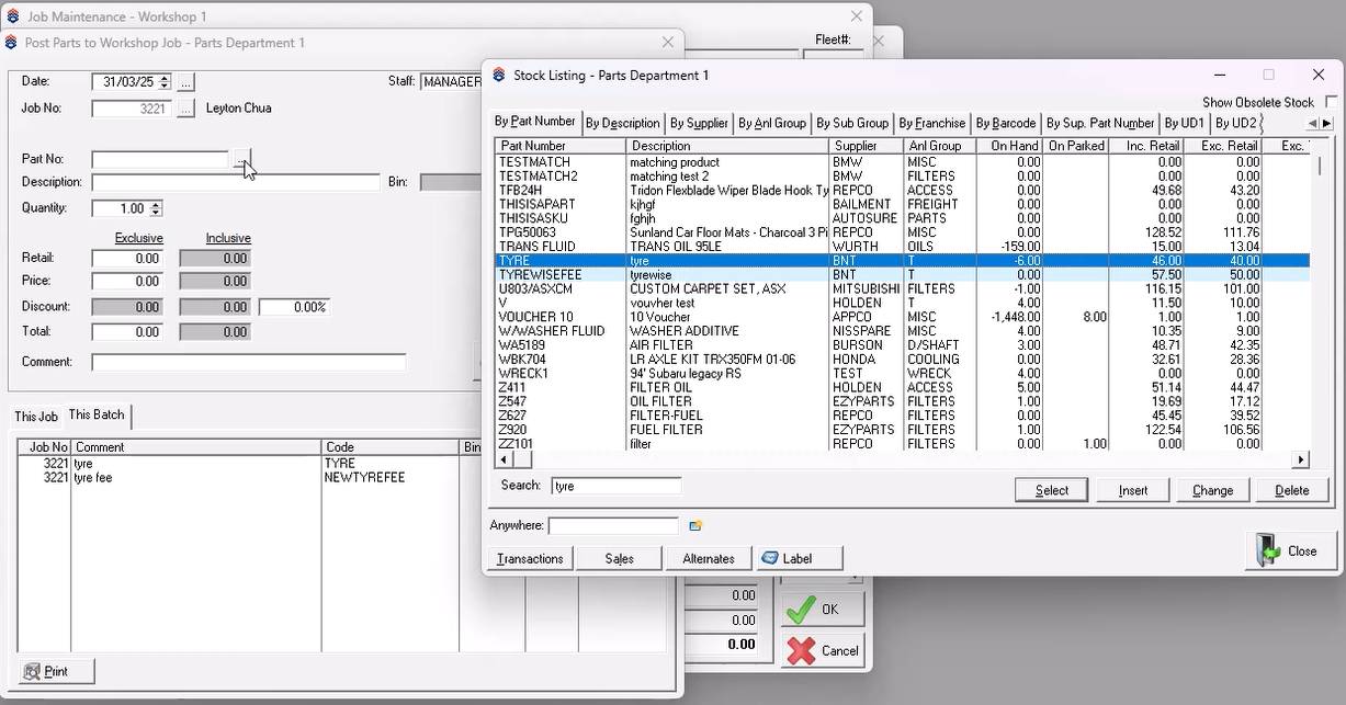 - Navigate to Workshop Module > Create/Open a Job > Add Part (e.g., Tyre).
