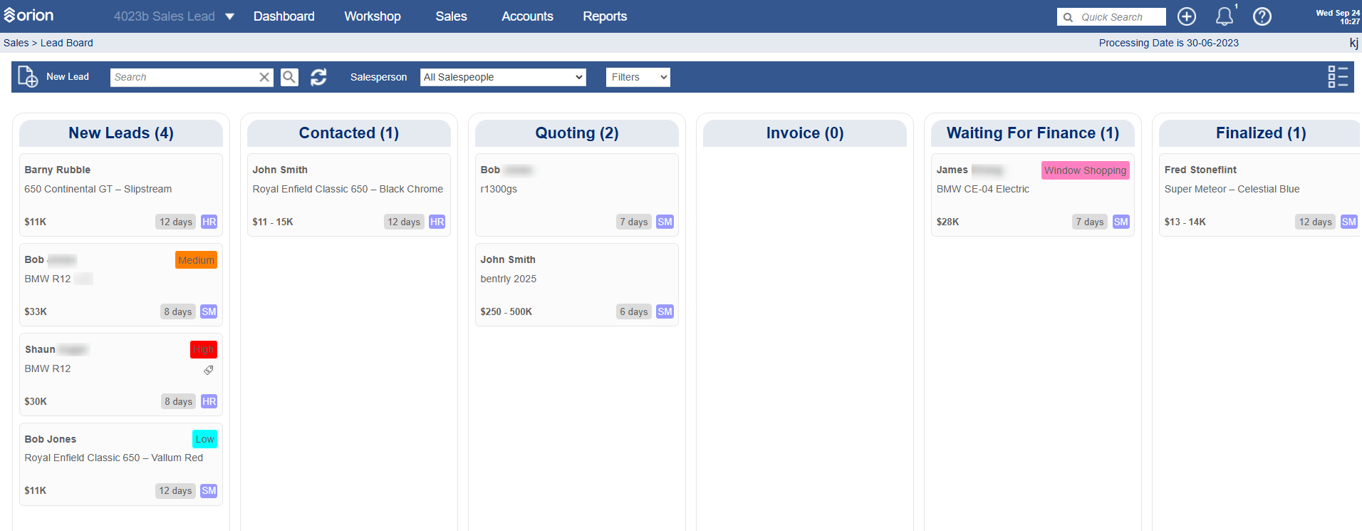 The Sales Workboard in Orion WebWorkshop is a visual workspace designed to help your sales team manage leads and prospects more effectively. It uses a pipeline view, where each column represents a stage in your sales process. This layout makes it easy to: